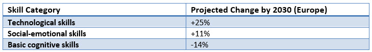 Third, fusion skills. The McKinsey Global Institute projects that by 2030, demand for technological skills in Europe will increase by 25%. Social-emotional skills will rise by 11%. But demand for basic cognitive skills could decline by 14%. This is a fundamental shift in what the labor market values.