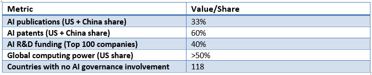 Consider the concentration of AI development. UNCTAD reports that the United States and China account for 33% of AI publications and 60% of AI patents. Just 100 top companies funded 40% of AI research and development in 2022. The US holds over half of the world’s global computing power.