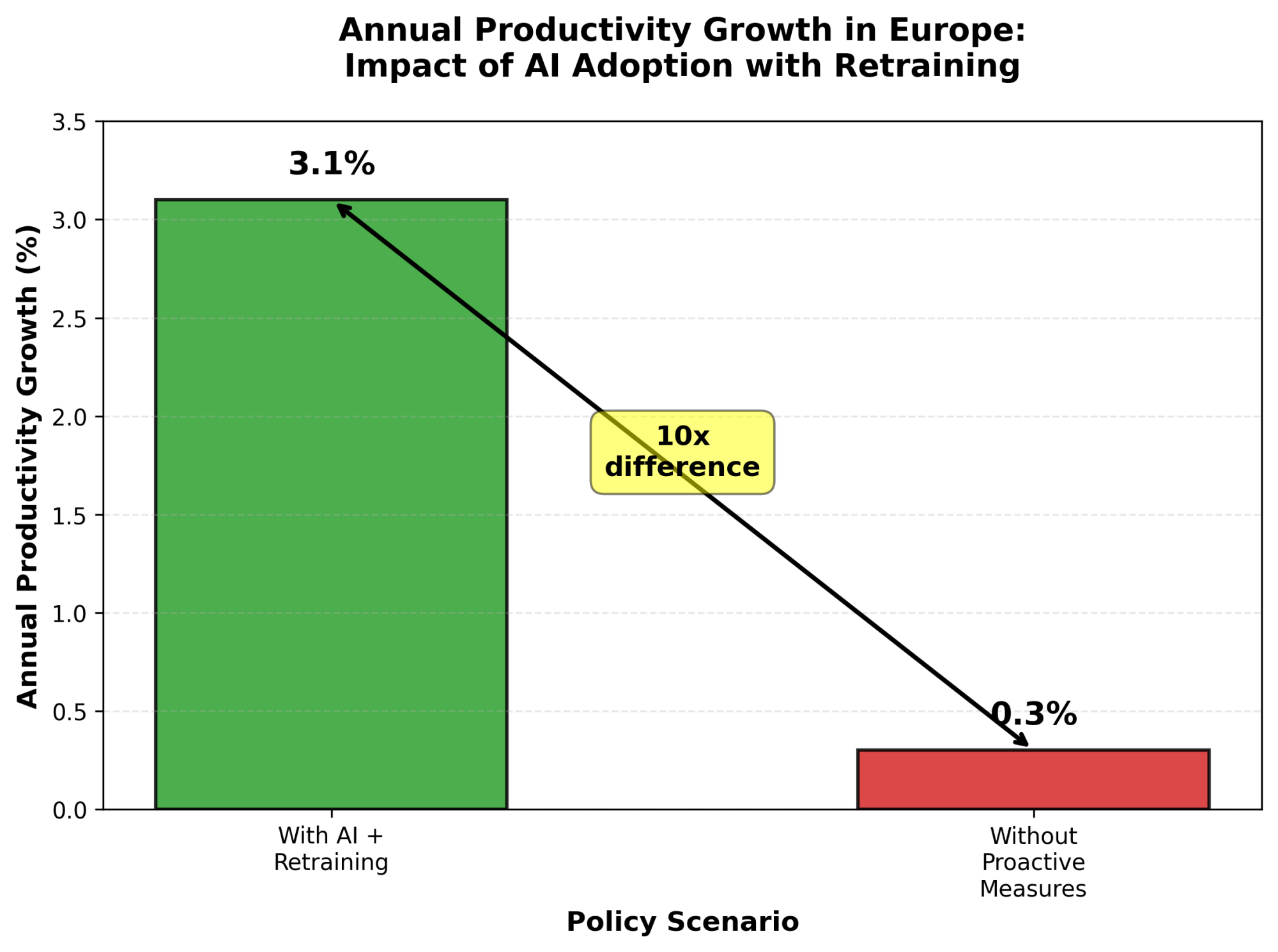 McKinsey estimates that rapid AI adoption combined with proactive workforce retraining could unlock 3.1% annual productivity growth in Europe. Without such measures, the growth rate might be only 0.3%.