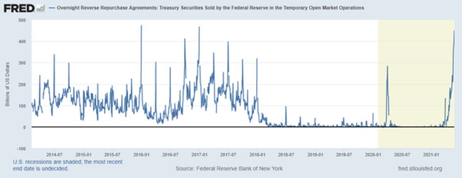 Towards the end of May, the FED made a large-volume reverse repo transaction. This is recorded as the highest level. Approximately $485 billion. We can say that reverse repo transactions have increased since March (https://www.reuters.com/article/usa-fed-reverse-repo-idUSL2N2NE2FH).