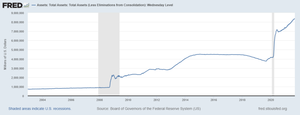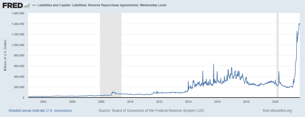 As can be seen in the graph, the Fed has made a reverse repurchase agreement of approximately 1.4 trillion dollars as of September 8, 2021. The previous high was around $1.05 trillion dollars in June. Obviously the Fed is collecting cash from the markets.
