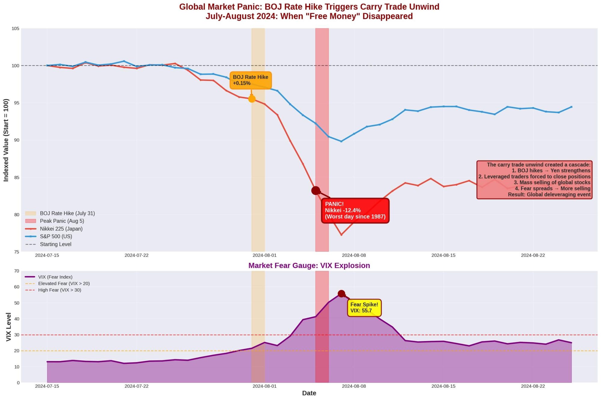 - VIX and market volatility: Sudden spikes in volatility, especially in August 2024 style moves, indicate carry trade stress.