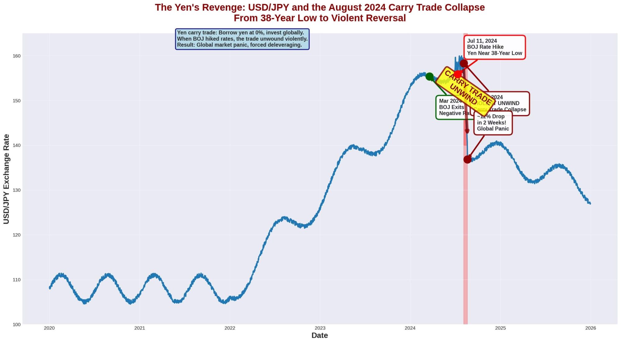 The yen surged. USD/JPY, which had been trading near 160, suddenly dropped 6% in days. That might not sound like much, but in currency markets that is an earthquake.