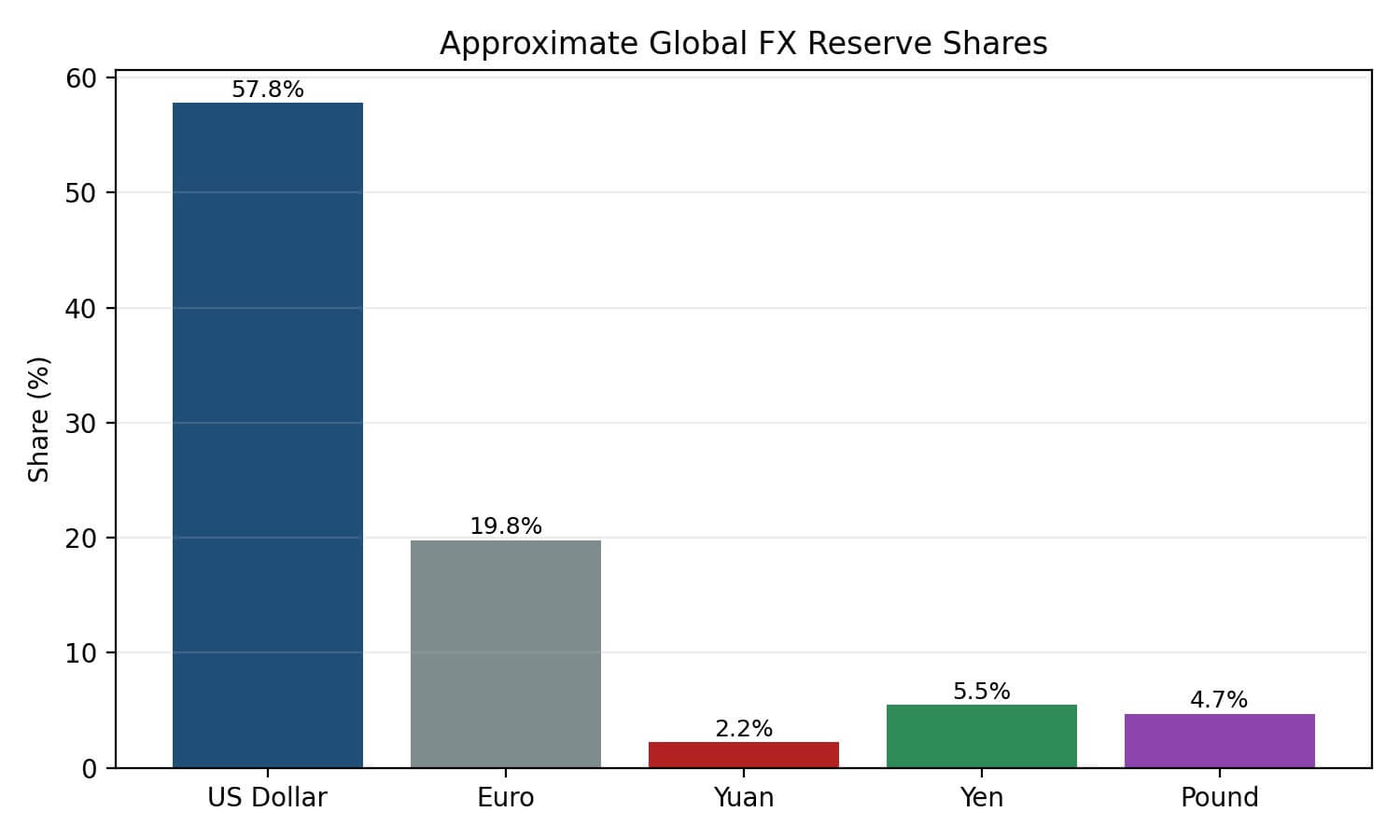 Figure 2. Approximate global FX reserve shares. The yuan is visible, but still small compared with the dollar and euro.