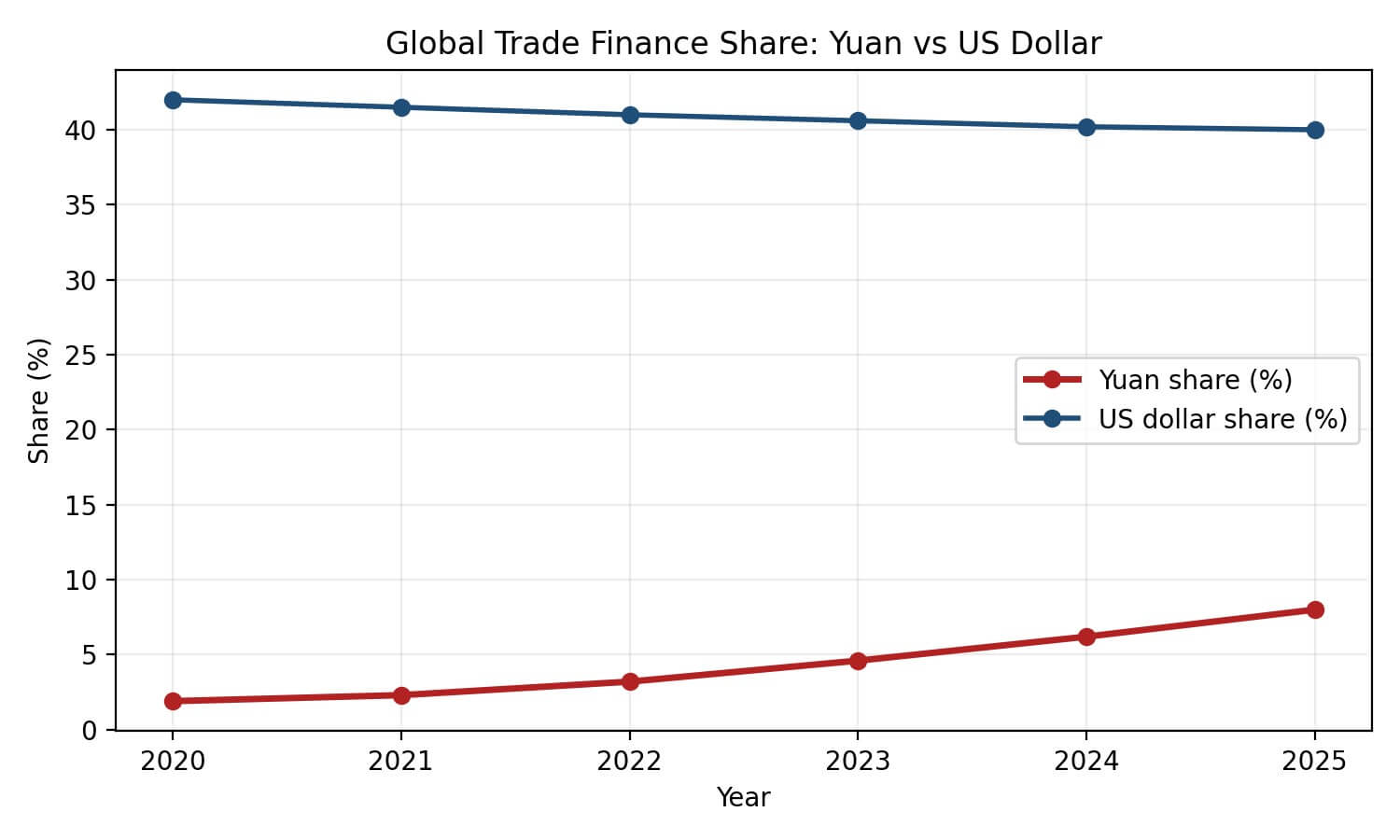Figure 1. Global trade finance share: yuan vs US dollar (illustrative compilation based on SWIFT-linked reporting and public commentary).
